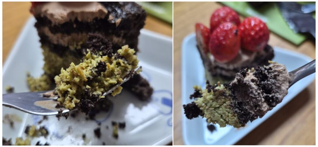 아래칸에 카다이프 피스타치오가 있구요, 위층에는 부드러운 초코 생크림으로 되어있습니다.
